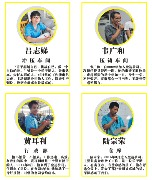 8月4日, 2016年度廣東金達(dá)勞動標(biāo)兵完滿落幕。該活動自7月初以來,歷時(shí)了1個(gè)月時(shí)間,經(jīng)過前期激烈的投票評選,金達(dá)公司堅(jiān)持公開、公平、公正的評選原則,建立管理層評選團(tuán)評審,實(shí)行員工代表無記名投票方式;經(jīng)過激烈的投票評選,最終廣東金達(dá)“2016年度勞動標(biāo)兵”名單火熱出爐:
